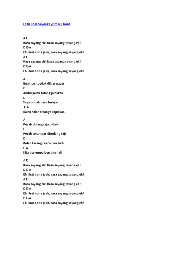 The refrain is then followed by a wide variety of popular malay pantun. Jika didengarkan, lagu ini layaknya seperti sajak atau pantun yang bersahutan yang merupakan tradisi lisan. Read more about this topic: Dapatkan lirik lagu lain oleh maluku di kapanlagi.com Rasa sayang (pronounced ˈrasa 'sajaŋ, literally loving feeling) or rasa sayange is a folk song from maluku, indonesia, popular in malaysia and singapore.