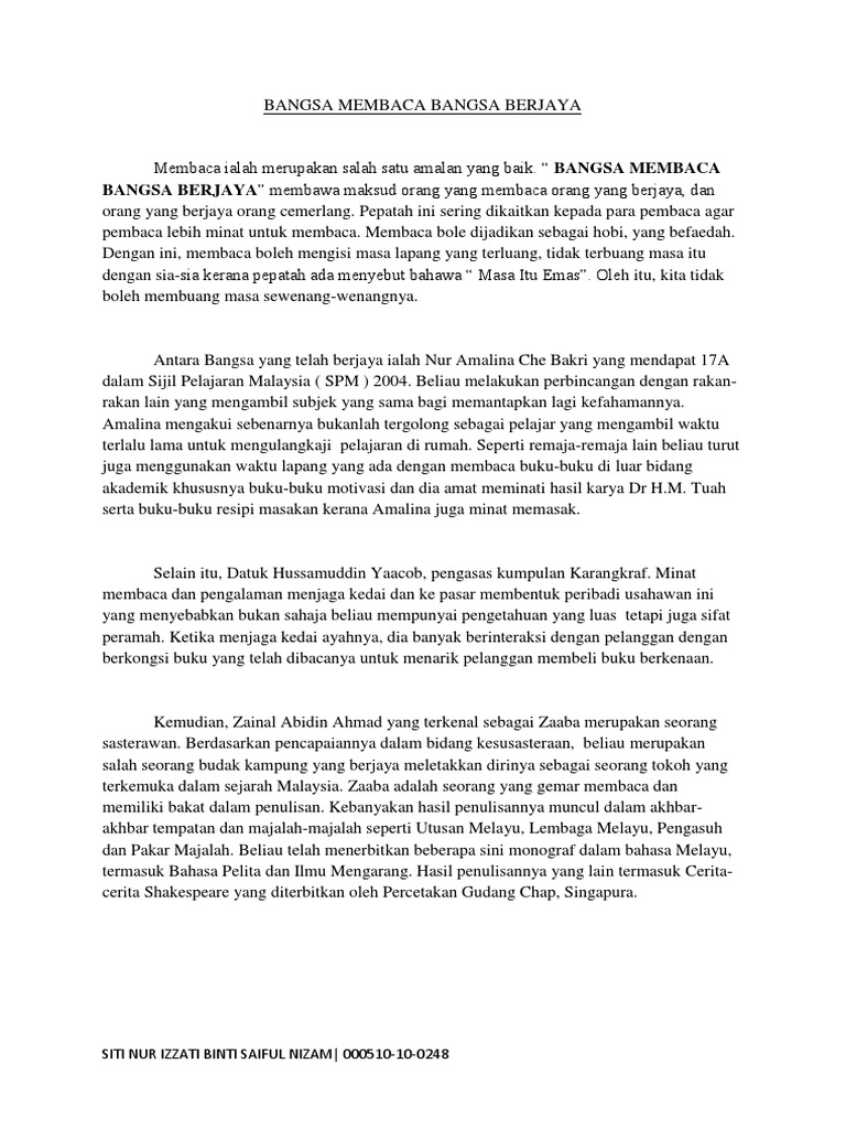 Membaca ialah merupakan salah satu amalan yang baik,bangsa membaca,bangsa berjaya membawa maksud orang yang membaca orang yang. Dapat dibayangkan banyaknya tulisan yang dihasillkan oleh setiap pelajar selama kurun waktu tiga tahun tersebut. Budaya m'bace komik dikurangkan.bukan x bleh cume kurangkn. Bulan julai rasmi sebagai bulan membaca kebangsaan azali azlan pelajar genius spm, tokoh nilam kebangsaan 2007 perpustakaan bergerak bantu pelajar di kawasan pedalaman. Bangsa indonesia pernah menjadi sorotan internasional karena memiliki minat baca penduduk terendah ketiga di asia (undp 2009).